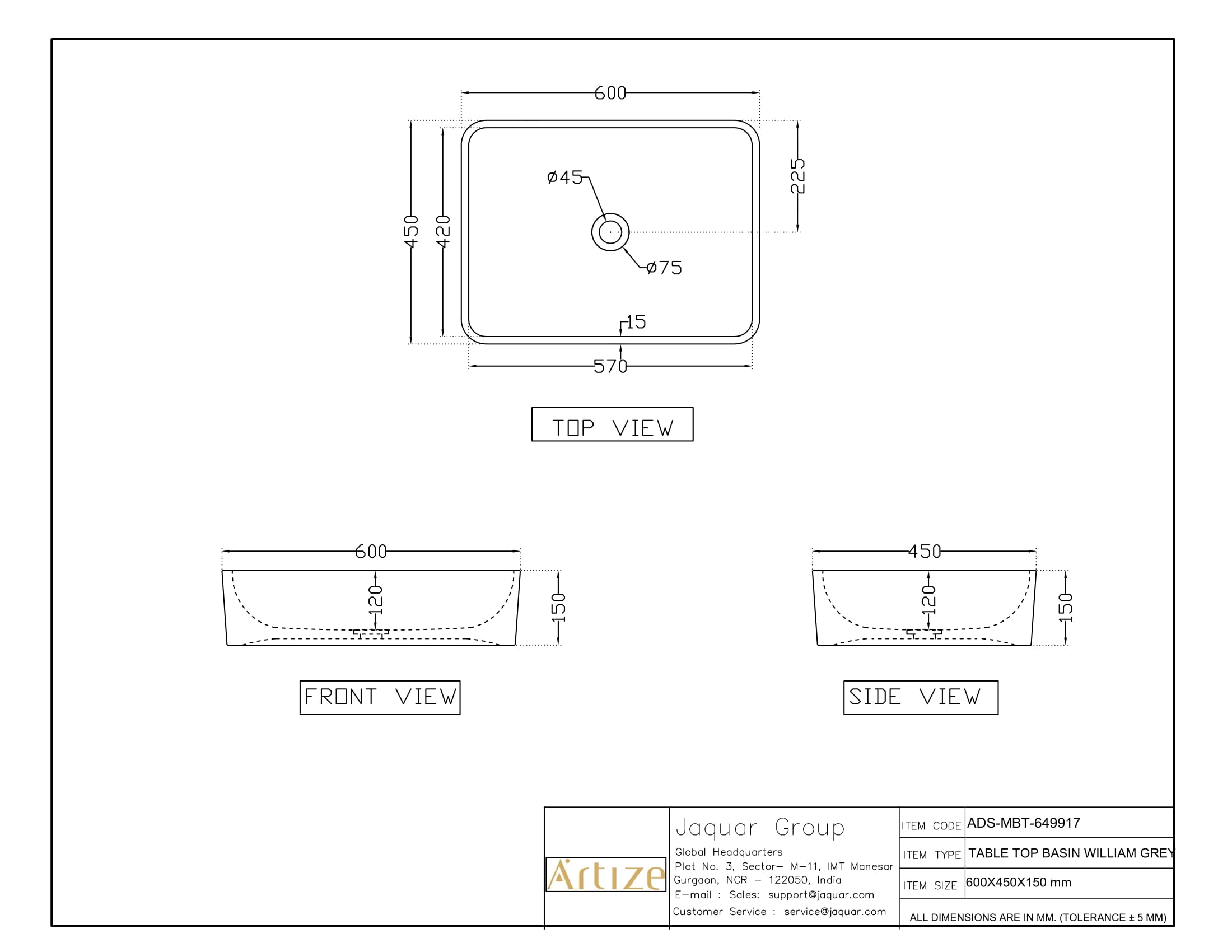 Table Top Basin - William Grey With Natural Veins, Size: 600X450X150 mm, Shape - Rectangular
